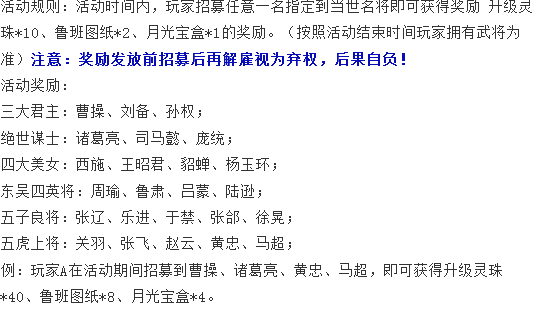 大概3-4的时间,你就能过小象低兵了,让区里的大佬帮忙压下小象低兵,在里面继续抓将,争取活动结束前获取最多的系统奖励,还有就是不管主城还是分城里面的武将一定要招满,并且都要升级,但是只需要升到35级,因为还有个武将比拼的奖励也是获取奖励的,主城如果有左慈和南华的情况下,只升一个就可以了,其他武将也是升到35级,如果有武力高的武将,可以升到36级,然后大概你玩的第9天就可以领到一部分奖励,然后你的主将左慈或者南华可以升到52级,修仙点到练气五层,全都带上兵去刷神左,争取第一时间抓到神左然后全力培养,如果有5个分城的情况下,那么6个城的科技就是羽林,神箭,纳贤令,太医学,建筑学和骑兵学等出保了以后,你的太守府可以升到19级,但是太学院和军营也要一直升,联盟科技里每天捐珠子,鲁班图纸和月光宝盒(后期黄金足够)或科技草图,30级的精武堂可以刷到超回复和幻术。